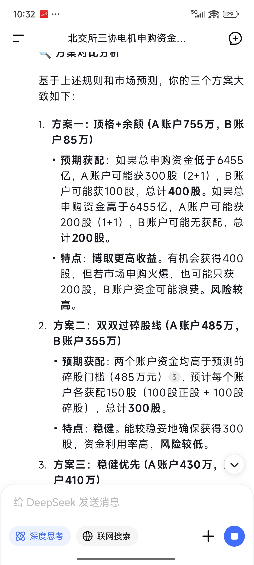 这次三协电机预测申购资金应该和巴兰仕差不多为7500亿左右。如果总资金小于6455亿,顶格申购能拿到2+1,碎股门槛会比较高。如果总资金超过6455亿(大概率事件),顶格只有1+1,碎股门槛会比较低。按照总资金6455亿计算:100股门槛大约377万,1+1门槛577万。按照总资金7200亿计算:100股门槛大约421万,1+1门槛516万。按照总资金7400亿计算:100股门槛大约432万,1...