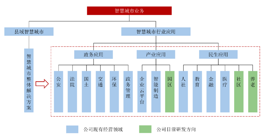 公司是一家专注于智慧城市领域的信息化项目方案设计、建设、运营的高新技术企业,主要业务涵盖智慧城市领域的信息化项目方案设计、软件研发、系统集成、运营服务等。公司围绕“政务、产业、民生”核心领域,融合大数据、云计算、物联网、GIS、人工智能等技术,通过自主研发形成信息化行业产品,为用户提供智慧城市综合解决方案;并利用在智慧城市领域多年积累的技术优势与行业经验,为用户提供可持续的运营管理服务。