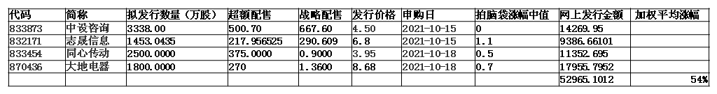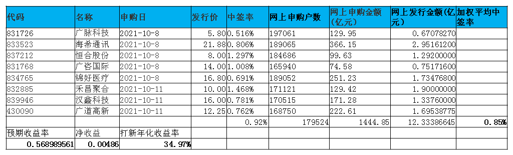 回顾一下10/8和10/11的第四轮第一幕的打新,本次共发行8支股票,网上发行金额合计12.33亿,累计冻结资金1444.85亿元,加权平均中签率为0.85%,平均中签率为0.92%。冻结资金最多的是海希通讯,达到366.15亿。中签率最低的是广脉科技,为0.516%。平均近18万人打新,远低于170万的开户数。