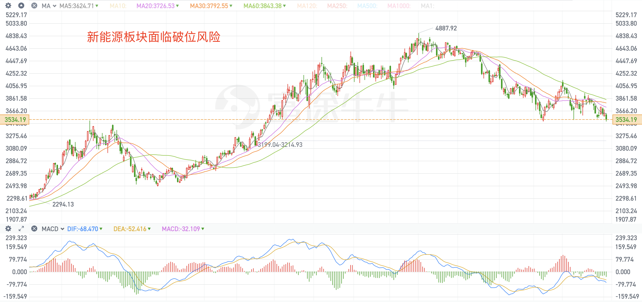 - 创业板的核心板块之一新能源板块持续低迷,已经处于震荡区间的下沿有破位风险,而这里一旦破位则极可能带动创业板指数也破位,进而带动大盘进一步下跌;