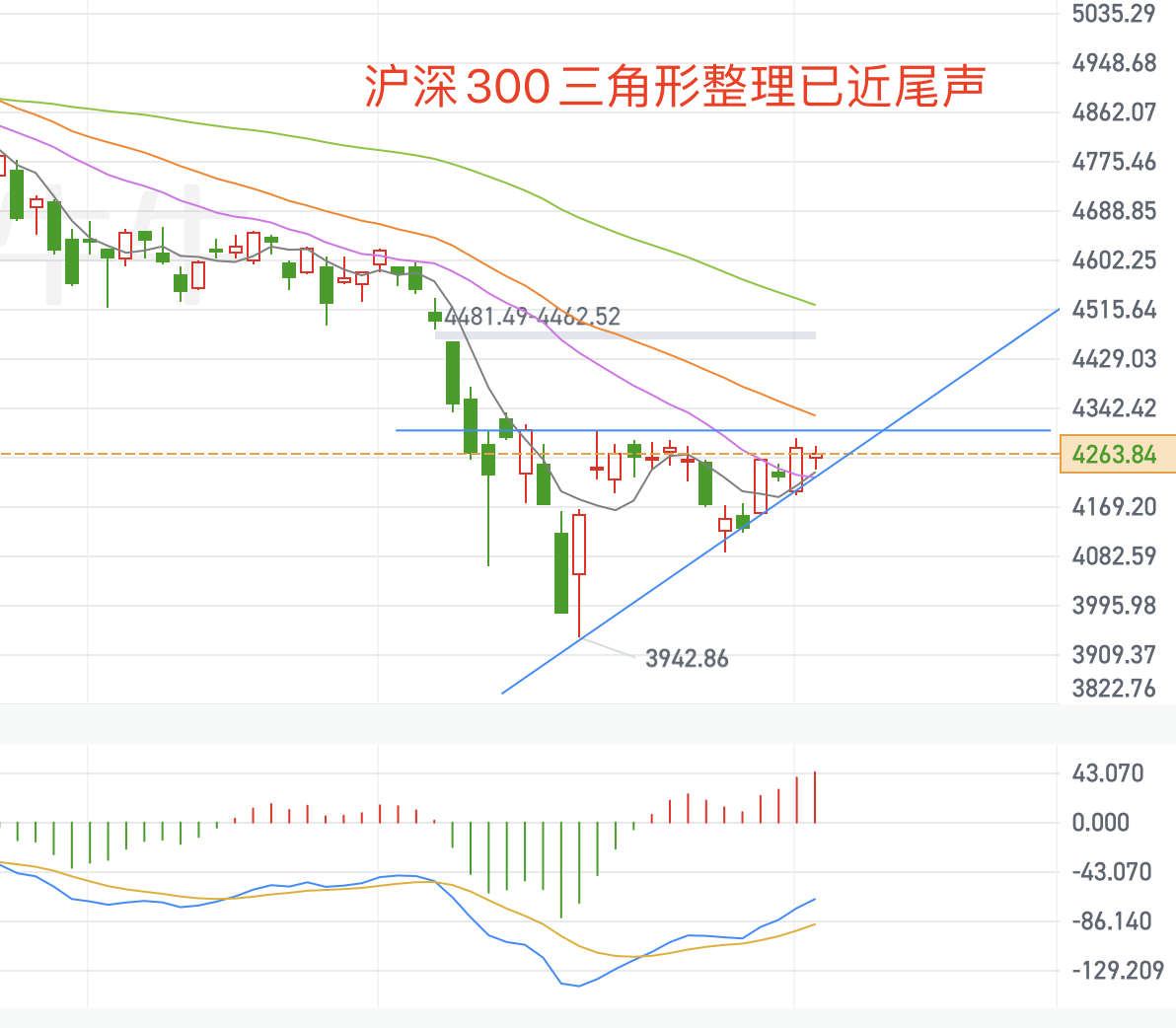 从技术形态来看指数在走一个三角形整理的形态,并且在节后就会进入三角形整理的末端,节后就会选择方向。