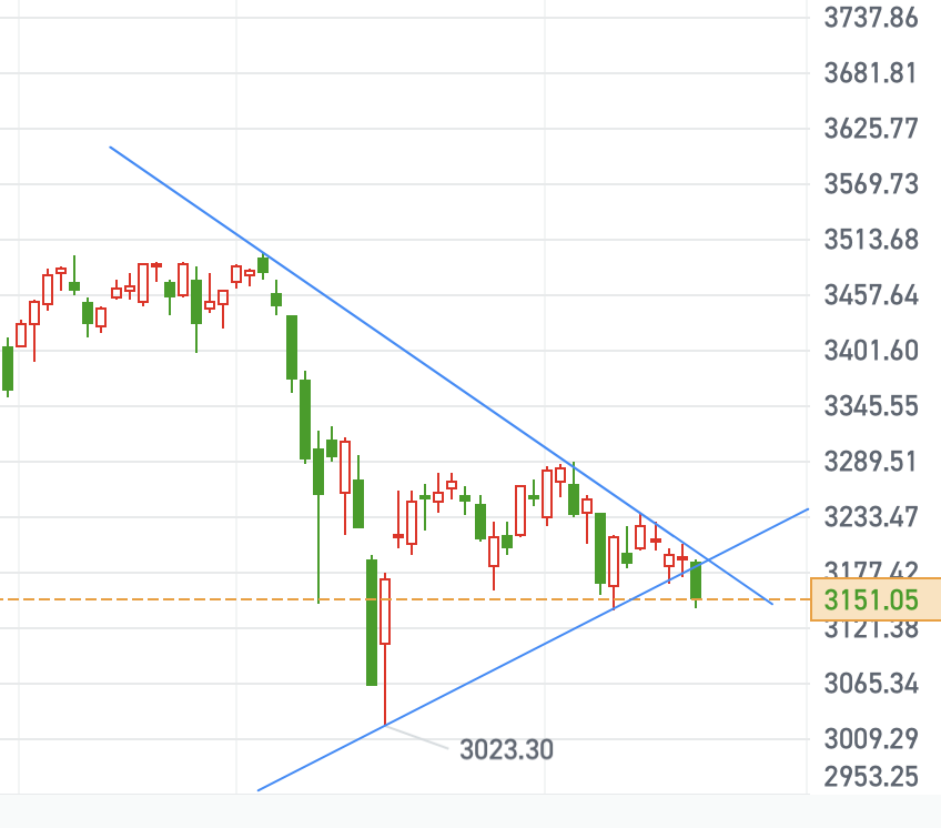 大盘自从3.16见底以来走了一个三角形整理的走势,目前已经到了三角形的顶点,即将选择方向,这里大概率会向下变盘: