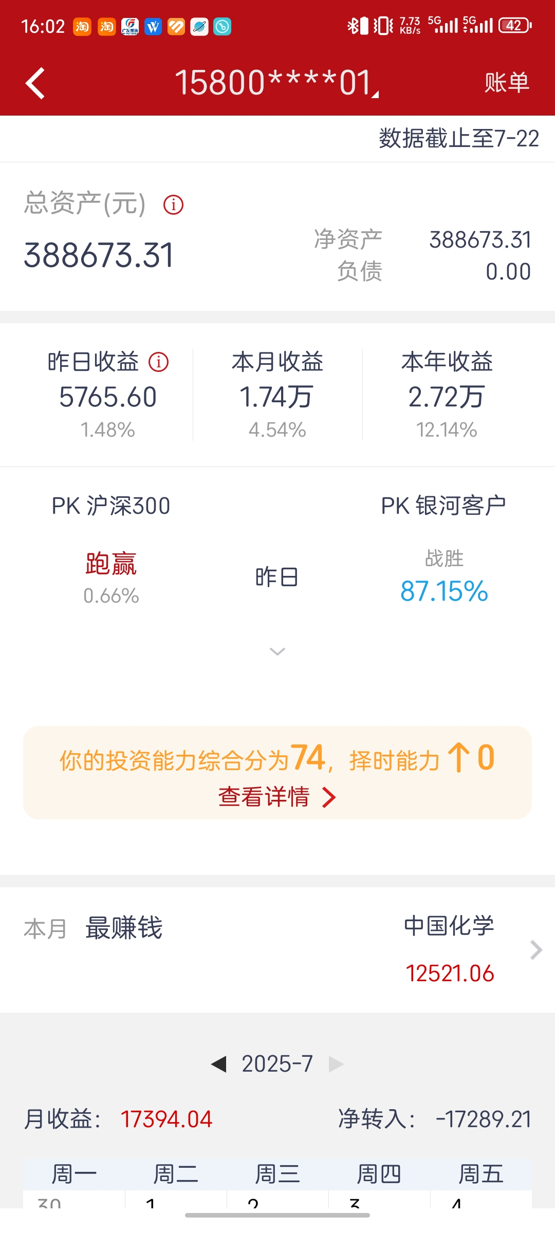 2025年7月7日,资金391000,本年度收益1.15w,远不及各位大佬,去年九月到现在收益2.82w,远远跑输大盘。要学的还是有很多。