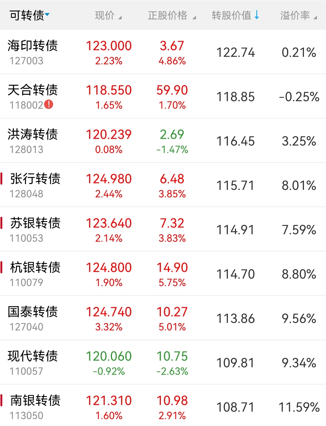 转债价格125元以下,转股价值最大的前9名中,第1名海印和第3名洪涛到期时间非常短,第2名已公告强赎。第3,4,5,9名这4只就是我买的4只银行转债。