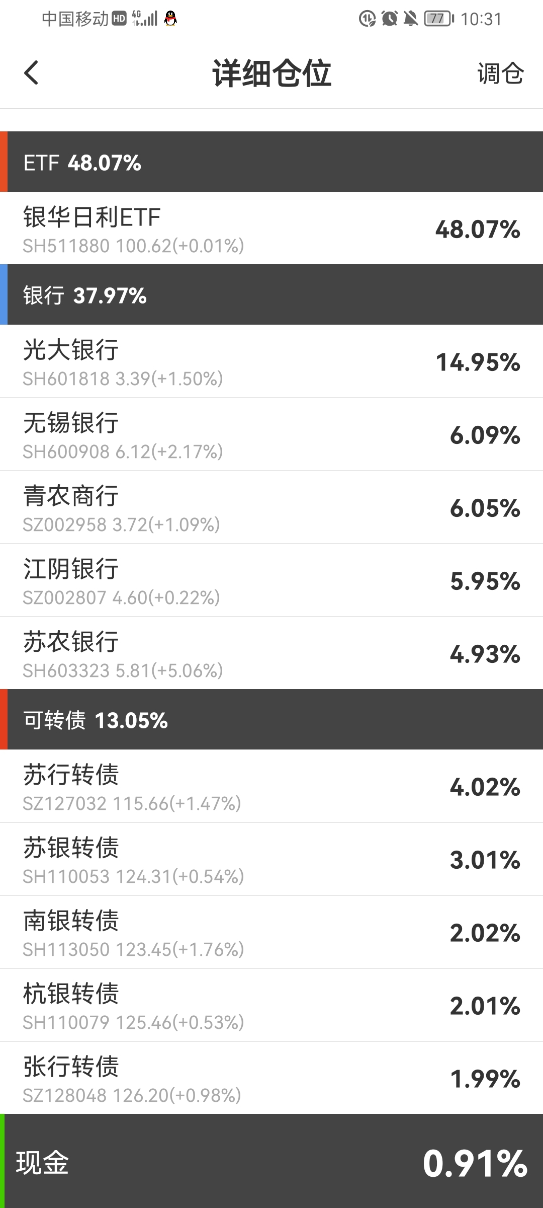 现在的8只持仓,其转债双低排位在第6,7,11,13,17,18,23,31名,全部位列双低前10%排列。这意味着银行板块强势崛起中,之前买银行,很多人都不看好,说太多人在银行中倒下了,而我这波进银行都是在有银行创新低后,逆势进场中。
