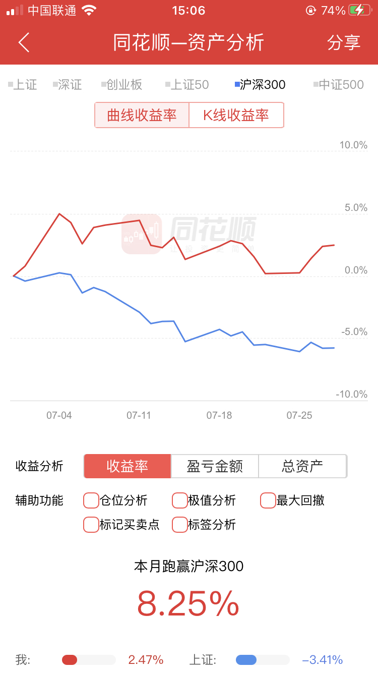 7月初,我公布了一份惨淡的中报(见《失去的胜利》帖子),不仅年内大幅亏损而且落后于基准300指数。但是,7月指数下跌,我不仅仅有正收益而且已经超额了300指数。