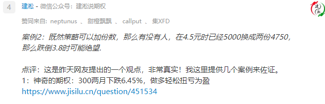 7:因为坚持卖方策略,所以我的帖子被网友渲染成卖方大本营。可是我自己一直坦言不公开推荐双卖战术。卖方并不等于双卖。12月初一轮短期暴涨暴跌让这个双卖战术的短板暴露非常彻底。可是大家在警惕低隐波状态下谨慎双卖的教训外没有领悟到另外一个风险:为了博取2020年7月这样的预期大涨,在这次向上攻击过程里期权向上移仓的实质风险(包括买购上移,卖沽上移和卖沽转买购)。