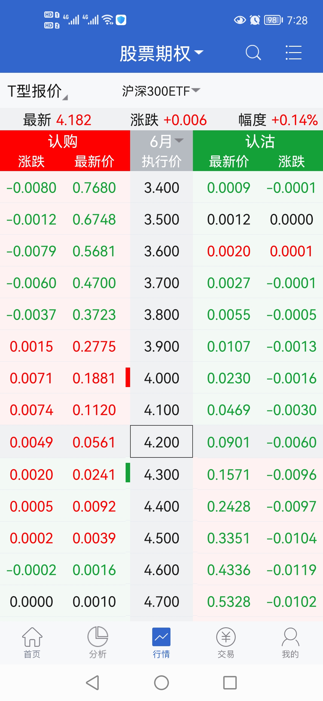300ETF收盘4.182元,我的对应6月4200沽收盘0.09元。