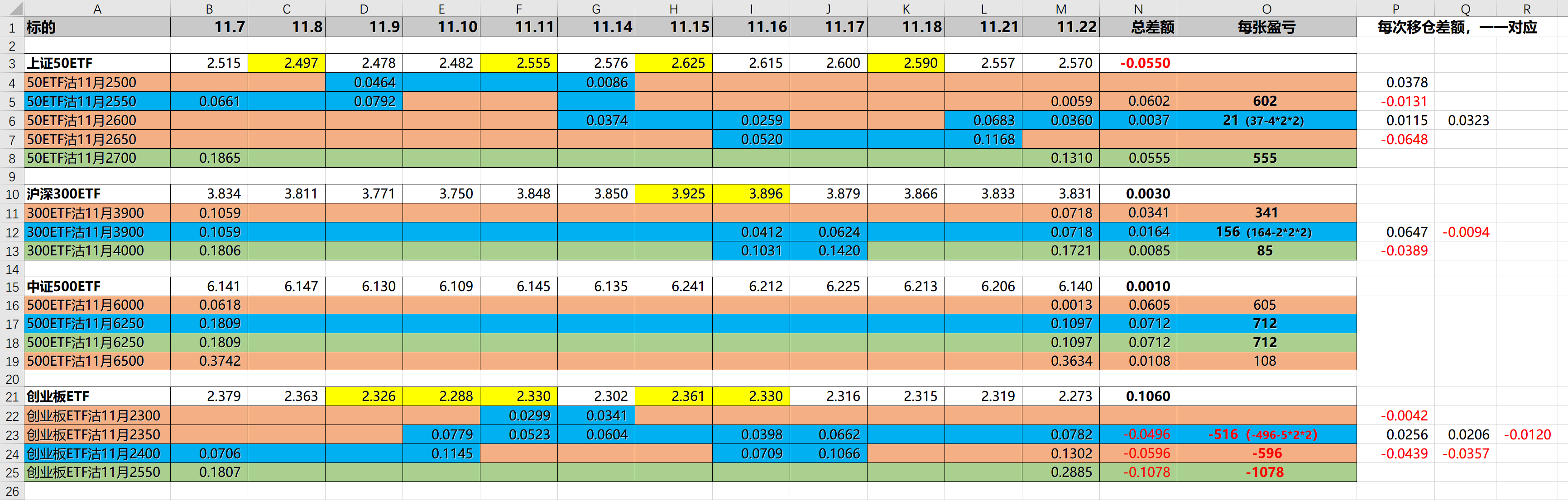 表格上的ETF黄色标记为换仓节点,合约的蓝色路线为策略的具体换仓路线,合约的绿色路线为较深度的实值认沽,最后的盈亏因为移仓有成本,手续费算2元,交易一次算2*2=4元。