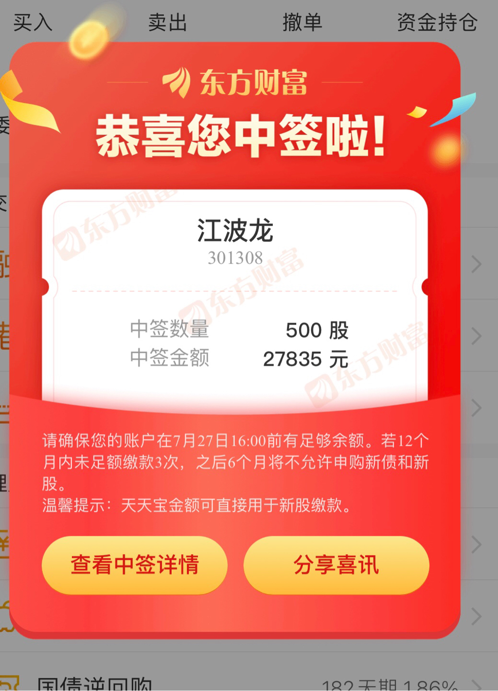 上次中的纠结要不要缴款,后来想了半天,心想这么重要的事情怎么能随便决定呢,当然是要抓阄啦,然后抓到没缴,帐户剩余的500块被认购上了,赔了30。