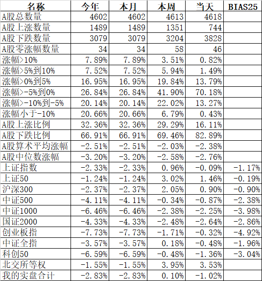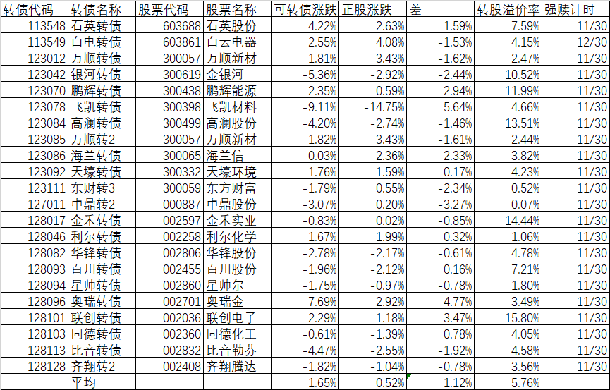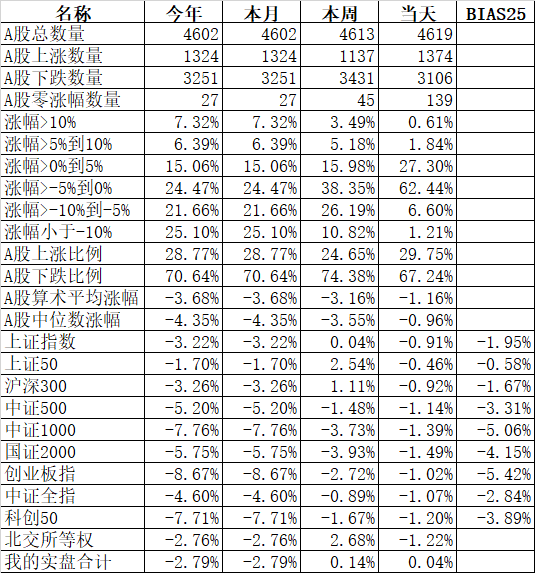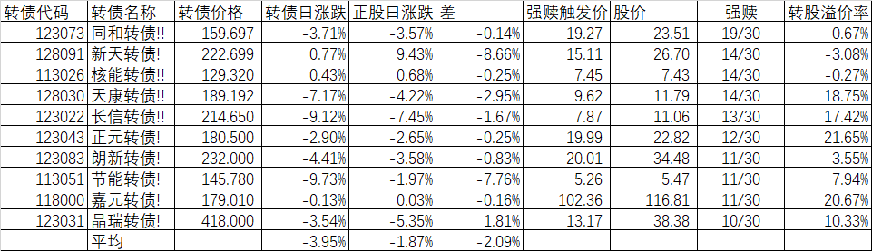 我的可转债今天表现也很差,唯一一个有点盼想的金轮转债,开盘就涨了20%停牌,结果它的正股从涨停一路下滑,在停牌的时候挂了个150元的价格,没想到复牌后就直接开在142元以下,还是我太贪了。今天跌幅最大的两只可转债我都有,钧达转债跌了12.10%、新天转债跌了13.80%。好在上周五在新天冲高的时候以195的平均价格卖了大部分,新天今天的收盘价是183.612元,算是多赚了6.20%,远远超过我回测的每次赚取3%多的阿尔法收益,否则今天亏损还要大。