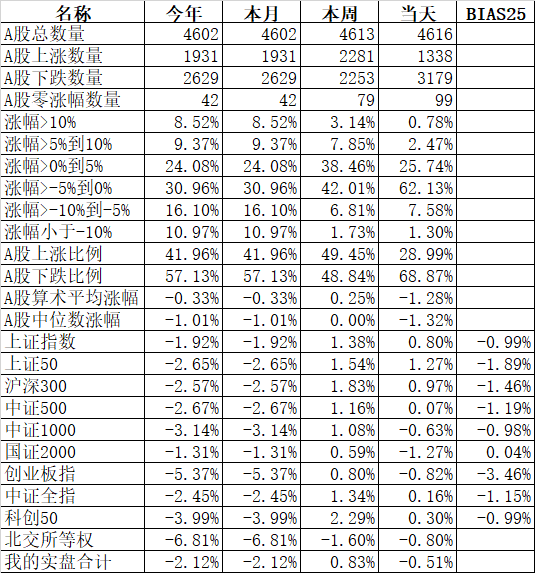 今天其实个股表现非常好,4602只个股中3299只上涨,比例高达71.69%,平均涨幅1.10%,个股涨幅中位数高达1.30%。