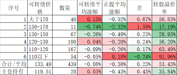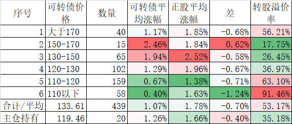 458只可转债对应的正股也大涨了1.78%,但可转债平均只涨了1.11%,过高的溢价率也要还债了,特别是56只110元以下的可转债,正股平均大涨了2.54%,可转债平均才涨了0.57%,但依然有平均86.46%的转股溢价率。所以价格过低的可转债因为转股溢价率过高,除了期望下修,很难有系统性的机会。