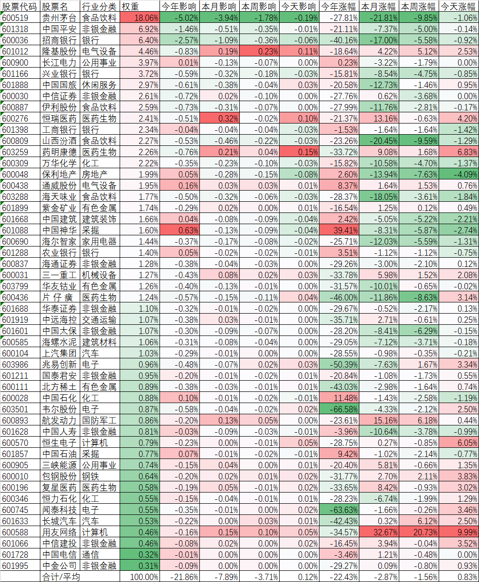 今天虽然上证50是上涨的,但最大的三个权重股:贵州茅台、中国平安、招商银行又是下跌的。估算了一下今年这三大权重股对指数的影响,贵州茅台影响了-5.02%、中国平安-1.46%、招商银行-2.57%,光这三只权重股今年对指数的拖累高达9.05%,占了三分之一强。