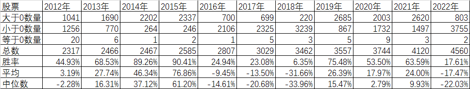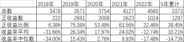 整体来说,5年里还是一头一尾的2018年和2022年(截止到9月16日)收益率的平均数和中位数是负的,而2019、2020、2021这3年收益率的平均数和中位数都是正的,而且正收益率的比例也是2018和2022这两年是小于50%,而2019、2020、2021这三年是大于50%的。