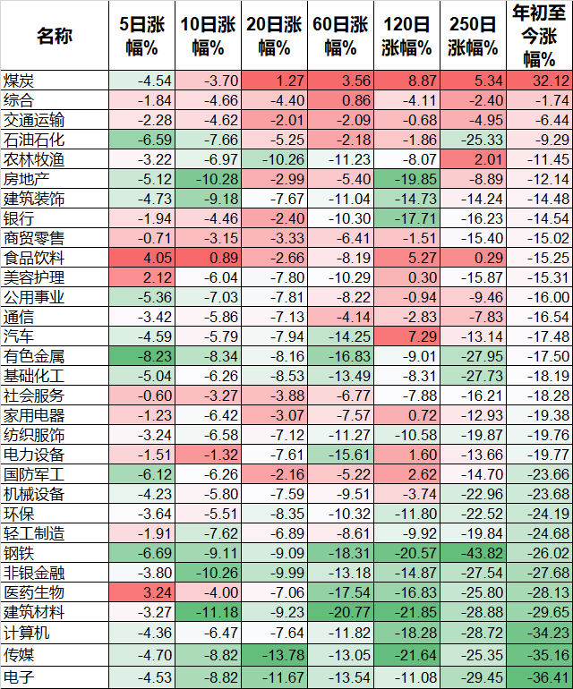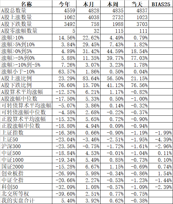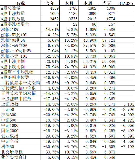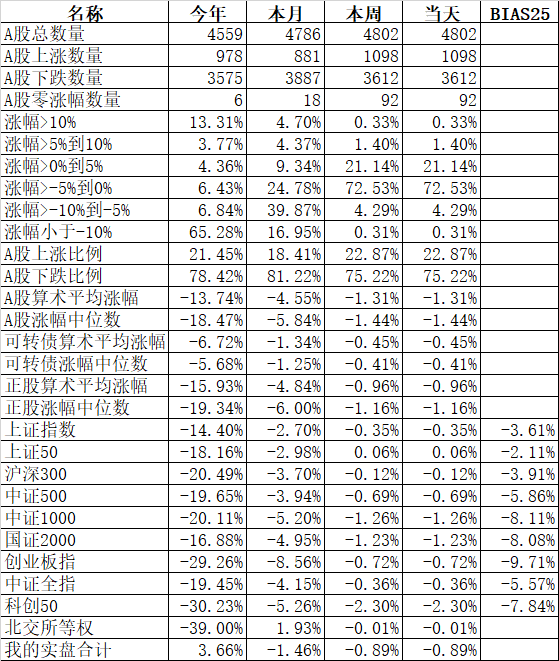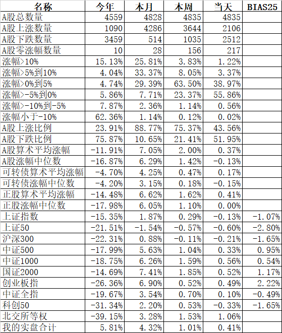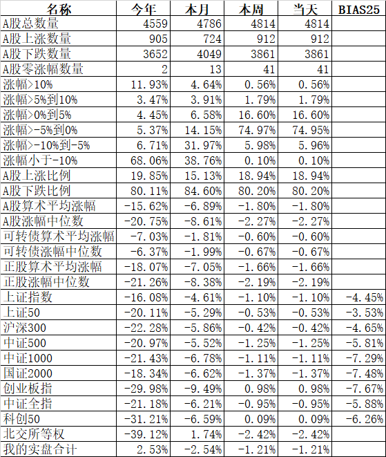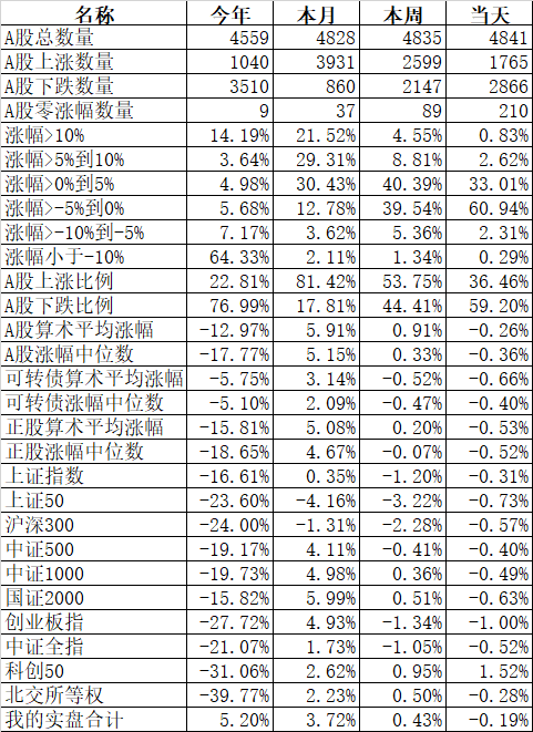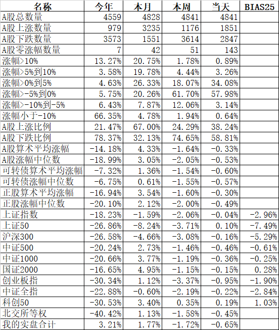 板块中也只有酒店餐饮、旅游、煤炭、酿酒等少数几个板块上涨,互联网、软件服务、工程机械、IT设备、建材等大部分板块还是下跌。金龙鱼、伊利股份、中远海控、京东方A、万泰生物、天山股份、山东黄金、福斯特、兆易创新、东方证券、闻泰科技、康龙化成等333只股票盘中创出了今年的新低。今天又是3600多只股票下跌,下跌中位数高达1.44%。今年全体A股跌幅中位数高达18.47%,也就是说如果今年你的账户亏损没超过18.47%,已经战胜了50%的股票了。