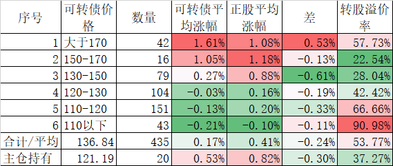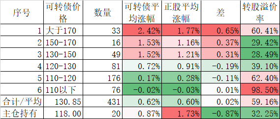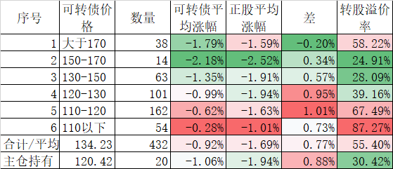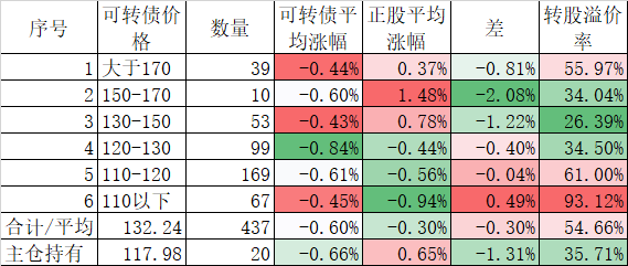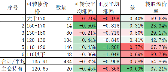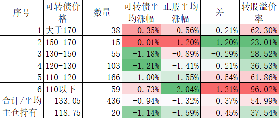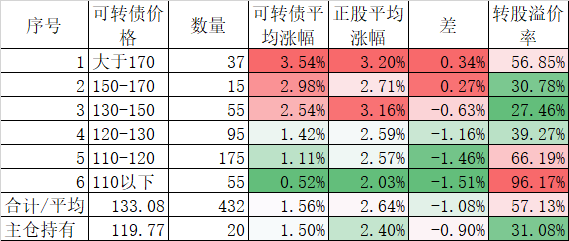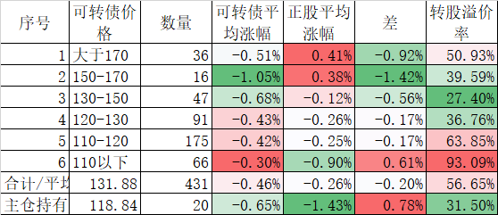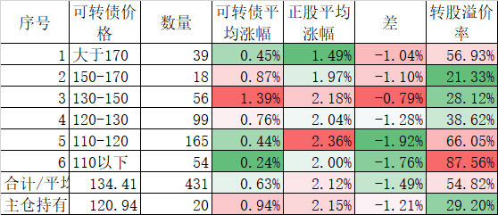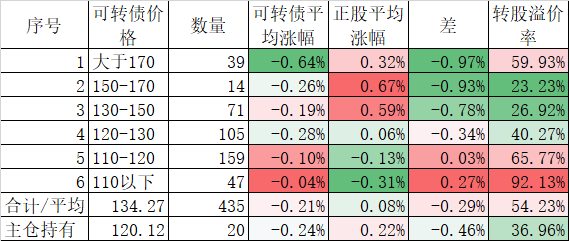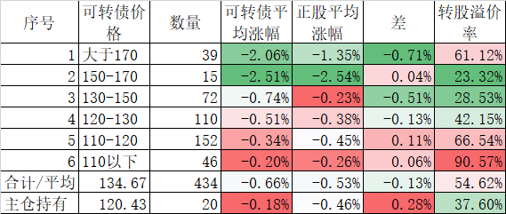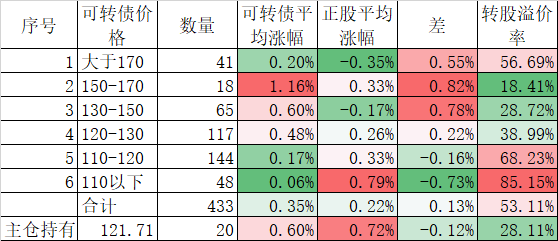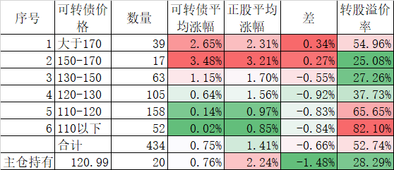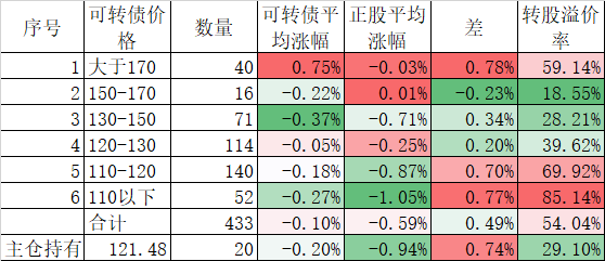 今天可转债算是跌的不多,而且正股平均下跌了0.45%小于对应的正股平均下跌的0.96%。今天我的账户跌幅大于了可转债平均跌幅,短期跑输也是正常的。主仓20只可转债的平均价格已经跌倒120元了,和全体可转债的中位数接近了,再跌应该有比较强的支撑。