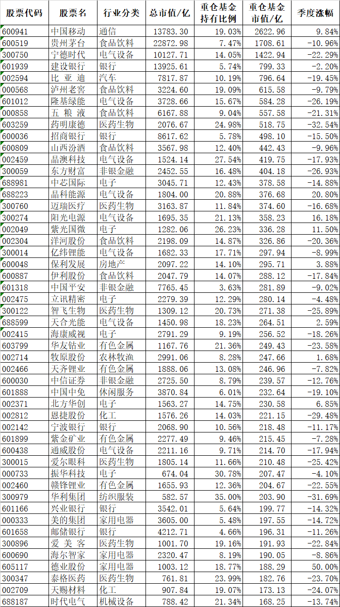 这些跌跌不休不断创新低的股票背后到底是什么原因呢?我们统计了2季度基金重仓在股票里的比例以及对应到今天的市值,排名前50名的都是耳熟能详的基金心头好:
