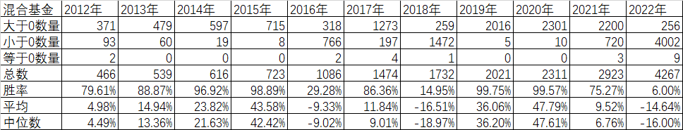 今天正好有个老同事打电话给我,说希望能比银行存款高但风险要小的投资。其实现在权益类的品种,比如混合型公募基金,就像我今天早上在雪球上贴的数据那样,从2016年起近7年每年都能取到正收益的,好几千只混合基金理只有21只,平均年化大概也只有6%多。况且过去7年没有年度的亏损,不代表将来不会出现,而且这些choice上被分类在混合型基金中,其实大部分我认为都是债券型基金。大部分都是股票的仓位低于转债的仓位。