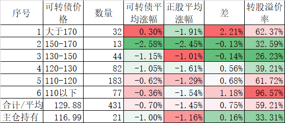 相比较股票的跌跌不休,可转债的表现要好很多了。今天可转债平均下跌了0.10%,对应正股平均下跌了0.59%。