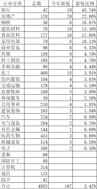 今天盘中有贵州茅台、招商银行、中国平安等167只股票创了今年新低。数量最多的行业是房地产,一共有29家,比例最高的是银行,42家银行里有19家创了今年新低,比例高达45.24%,比例超过10%的行业有银行、房地产、钢铁、建筑材料、食品饮料、家用电器等6个行业。