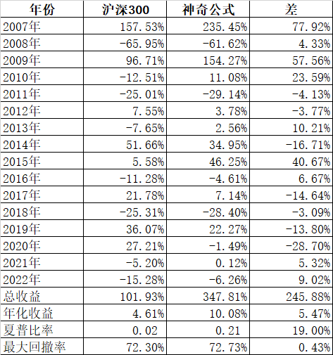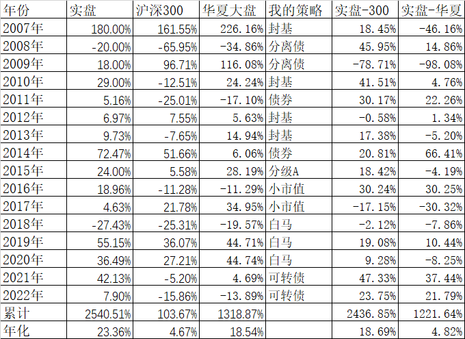 再看每年,其实也没有特别耀眼的收益率。比如200、2010、2012、2013这四年采用封基策略的年份,2007年跑输华夏大盘46.16%,2013年跑输5.20%,只有2010年跑赢了4.76%、2012年跑赢了1.34%。跑赢华夏大盘20%以上的有5年,2011年靠债券跑赢了22.26%、2014年也是靠债券跑赢了66.41%,2016年靠小市值跑赢了30.25%,2021年靠可转债跑赢了37.44%、2022年靠可转债跑赢了21.79%。而这5年沪深300指数除了2014年是上涨的,其他4年都是下跌的。