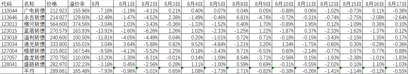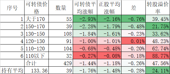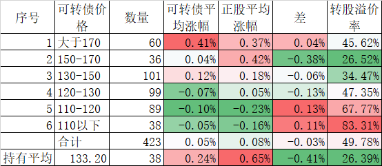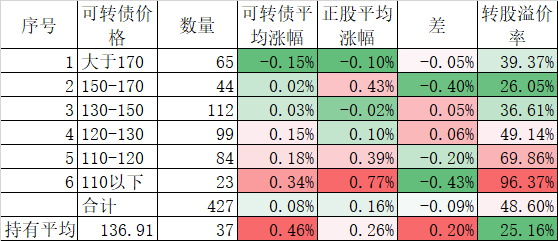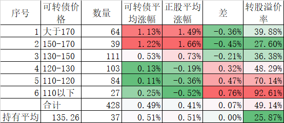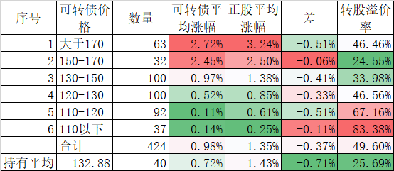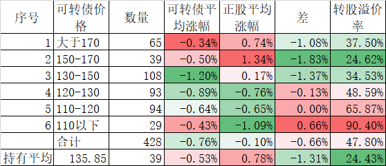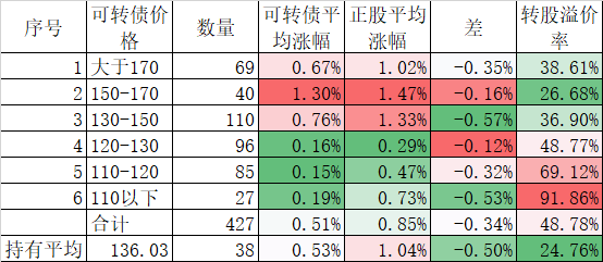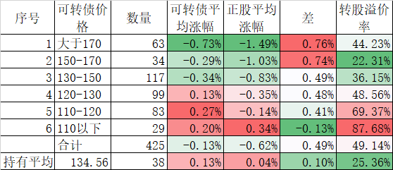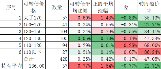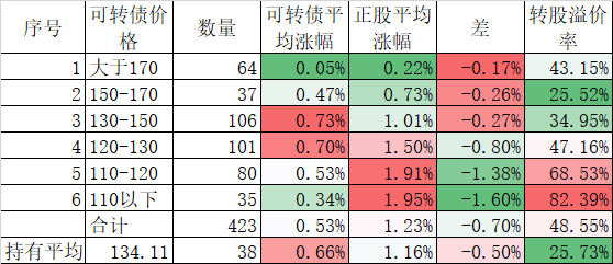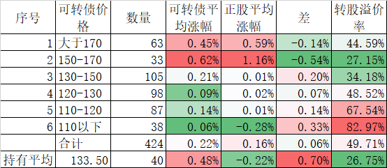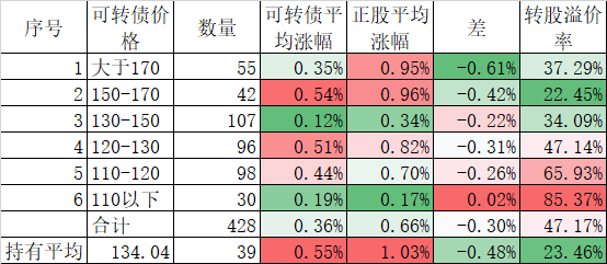 今天可转债也是普涨,虽然涨幅略弱于对应的正股,但分价格看,30只110元以下的可转债,平均涨幅0.19%,已经略大于对应的正股的平均涨幅0.17%。差异比较大的是55只价格大于170元的可转债,特别是双高的妖债,比如通光转债,正股上涨2.06%,可转债却下跌了2.47%,即使这样,转股溢价率依然高达134.70%,可转债价格高达307.80元。这样的妖债如果没有柚子来兴风作浪,一路下跌是大概率的。
