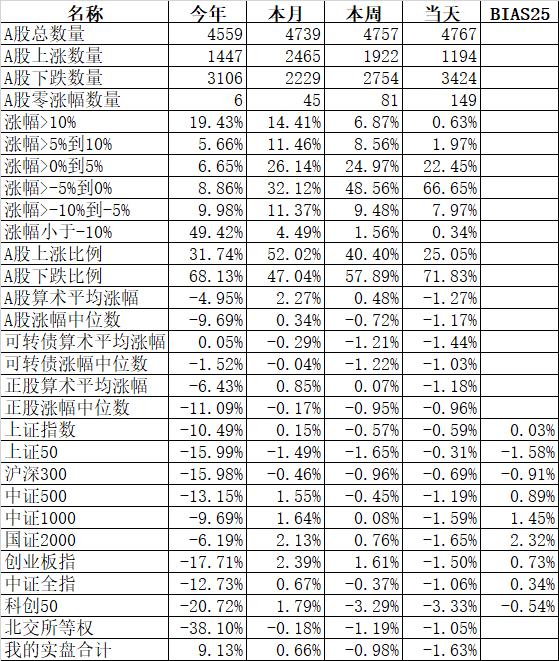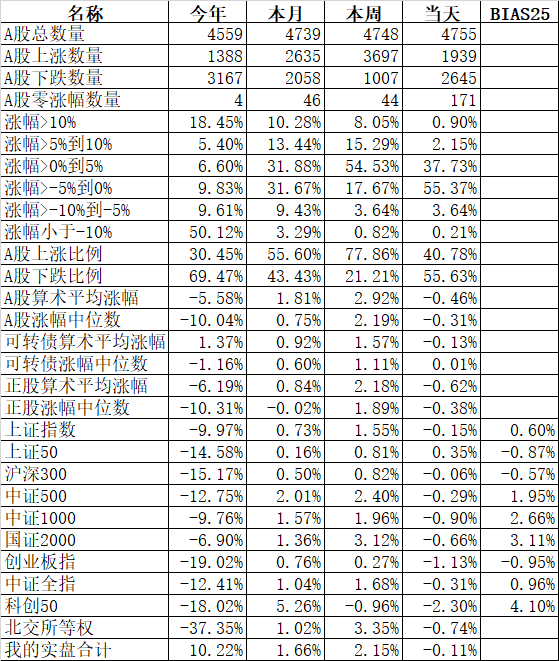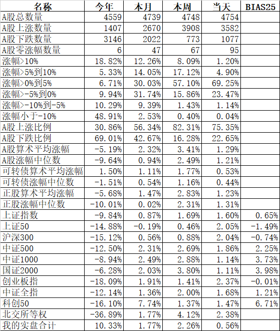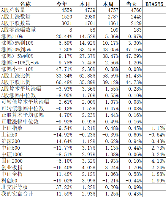 和迪森转债说再见A股最近确实是强,昨天晚上美股再次大跌,A股也没受多大影响。 最终宽基指数涨跌各半,涨幅最大的国证2000涨0.65%,跌幅最大的上证50跌0.75%。行业板块指数中也是涨跌各半,供气供热、矿物制品、煤炭、石油、电气设备等领涨,建材、酿酒、家居用品、航空、医疗保健等领跌。个股上涨49.21%,下跌47.37%,涨幅中位数正好等于零。北上资金净卖出了92.28亿。今天我查了一下今年...