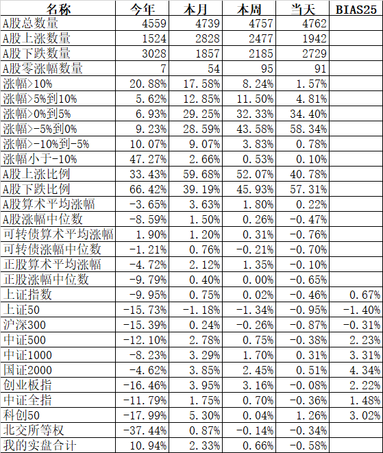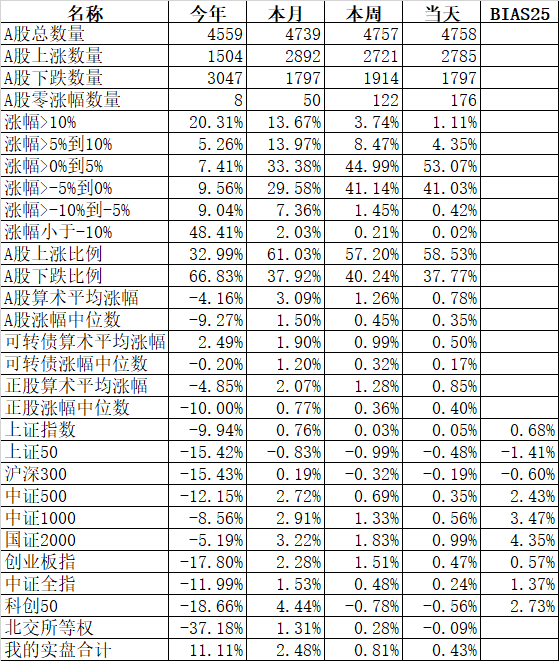 行业板块中有色、家居用品、化工、煤炭、船舶、旅游等领涨,下跌的只有通用机械、证券、电力、银行、半导体、保险等少数板块。近60%的个股上涨,涨幅中位数为0.43%。北上资金也净买入了43.25亿。