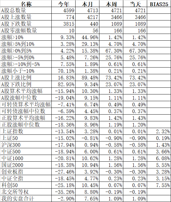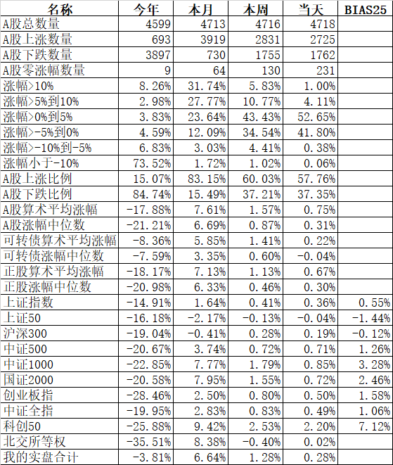今天指数又和个股开始背离了。除了中证1000、国证2000、科创50这3只宽基指数是上涨的,其他如上证指数、深证成指、上证50、沪深300、中证500、创业板指等都是下跌的。但个股倒是有近60%是上涨的。