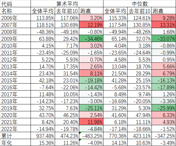我从choice里导出了历年混合基金的每年复合净值增长率,计算出累计5年净值增长率前10名的基金,在下一个年度的表现。举例说,2007年算术平均118.51%,是当年所有混合基金的净值增长率的平均值,而前10的122.47%,是指前5年,也就是说从2002年到2006年这5年里净值增长率最大的前10只基金在2007年的净值增长率。其他年份以此类推。我们看出,从2007年到2022年,5年前10在次年战胜平均值的年份有2007、2008、2010、2011、2012、2013、2019、2020、2022年,一共有9年,跑输的年份有2009、2014、2015、2016、2017、2018、2021年,也有7年。平均跑输了0.66%,看不出有任何优势。