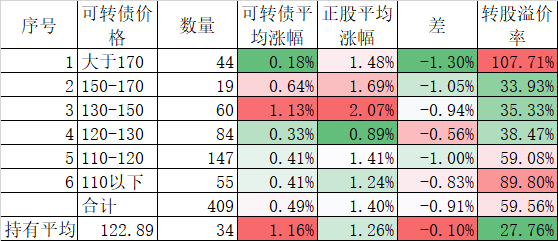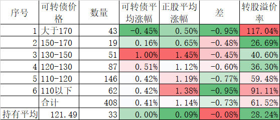 今天可转债对应的个股表现不错,平均上涨了1.40%,但全体可转债平均才涨了0.49%。还是因为前期柚子吧双高债炒作的原因,170元以上的可转债,对应的正股平均上涨了1.48%,但可转债平均才涨了0.18%,即使这样,170元以上的可转债的平均转股溢价率依然高达107.71%。比如妖债溢利转债,今天正股涨了0.32%,可转债反而大跌了6.14%。即使这样大跌,234.65元的可转债,溢价率高达136.95%。天下没有免费的午餐,最后总要有人买单。