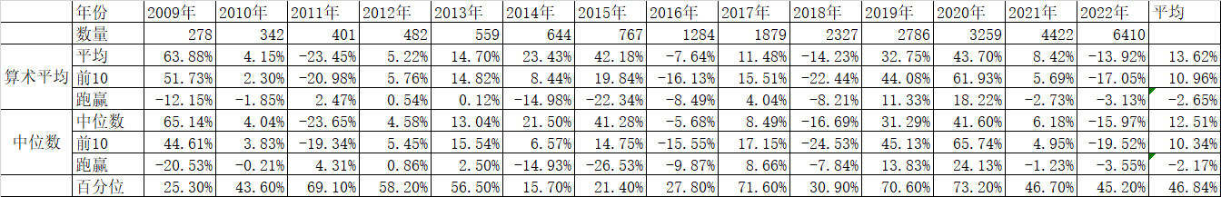 我们担心个别数据对结果的影响,再用中位数来比较一下。跑赢的年份有2007、2008、2010、2011、2012、2013、2017、2019、2020年,也是一共9年,跑输的年份是2009、2014、2015、2016、2018、2021、2022年,也是7年,平均跑赢0.50%,一样看不出5年冠军的优势。
