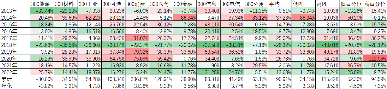 沪深300一级行业指数有300能源、材料、工业、可选、消费、医药、金融、信息、电信、公用等10个指数。从2012年12月31日到2022年5月20日近10年,表现最好的300消费涨了386.87%、最差的能源跌了30.60%,平均上涨了90.91%。