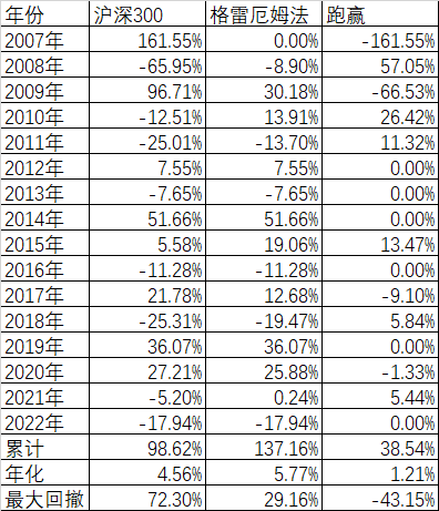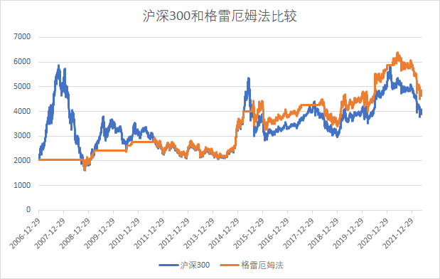 我们再看看沪深300指数和用格雷厄姆方法优化的对比,就能很明显的看到好处,虽然2007年、2009年、2015年几个大牛市的顶部都没吃到,但回撤也少了很多,从最大回撤72.30%一下子下降到29.16%,下降了整整一半都不止。这种平稳向上的收益率可能更加适合我们普通投资者。
