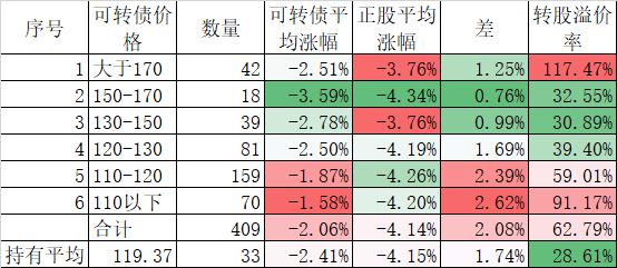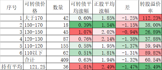 今天可转债的表现远不如股票,其实可转债对应的正股涨幅还不错,就是今天在还前面的债,特别是170元以上的可转债,正股平均涨了0.50%,但43只高价可转债却平均下跌了0.45%。170元以上的可转债,转股溢价率平均高达117.04%,甚至比110元以下的可转债更高。树不可能涨到天上去,总会有还债的一天。