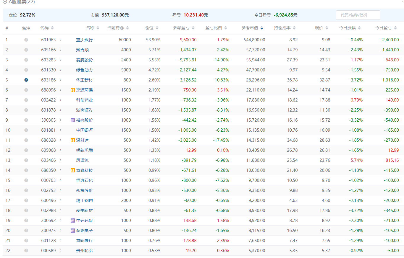 本大饼仓位55%持有重庆银行,该股涨跌对大饼净值影响巨大。