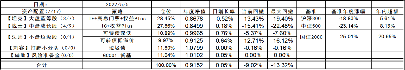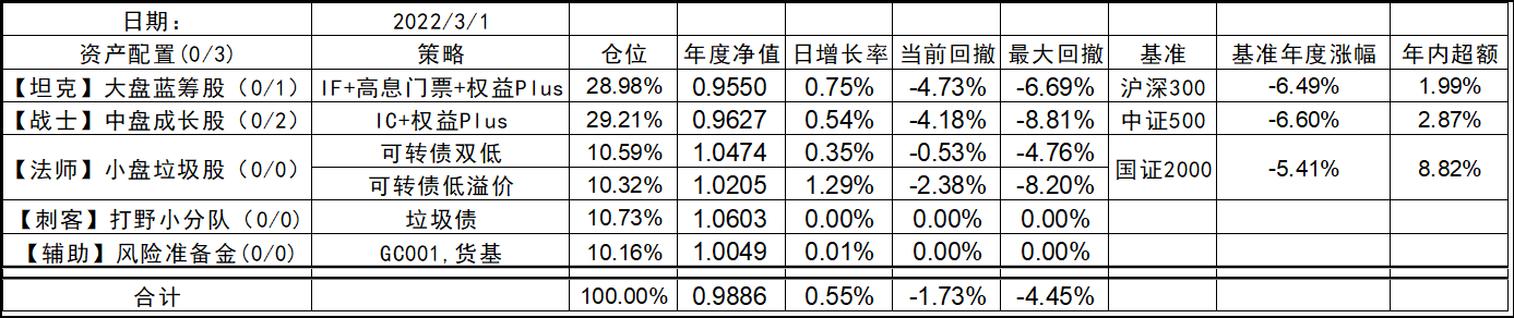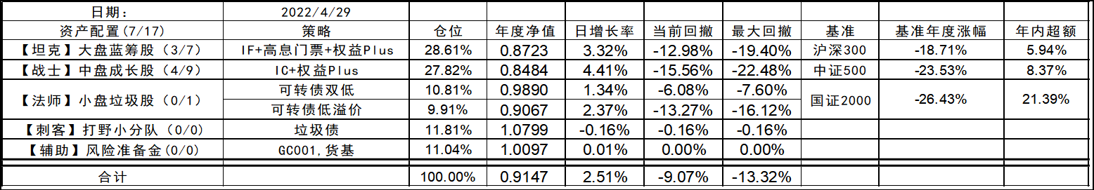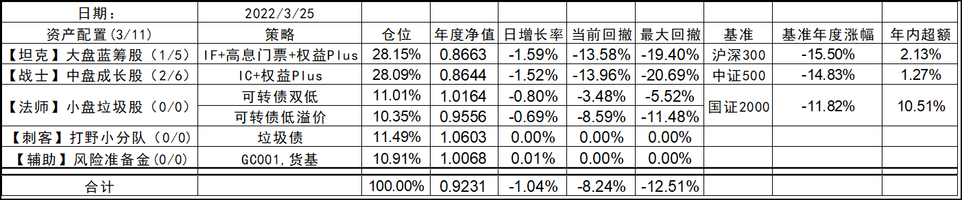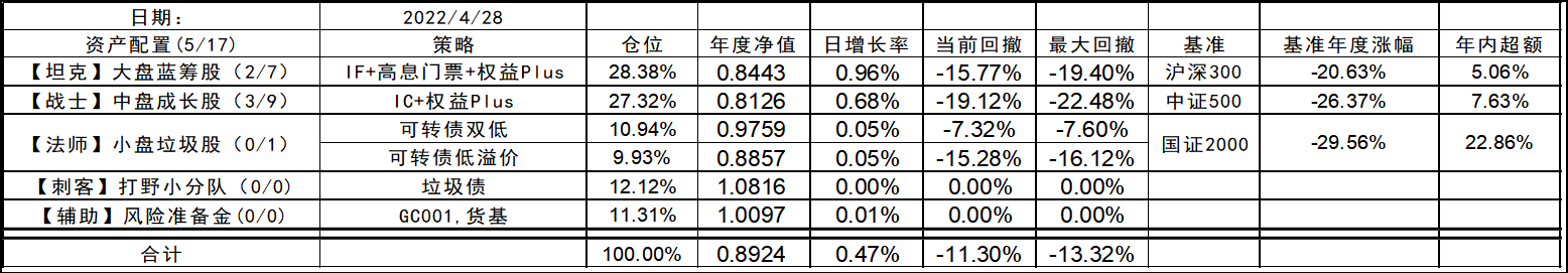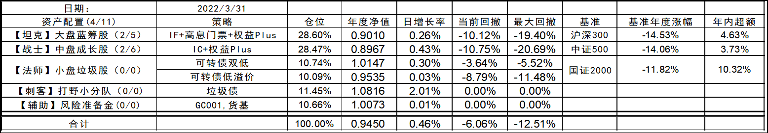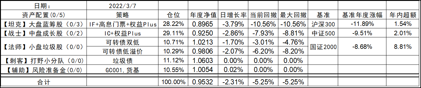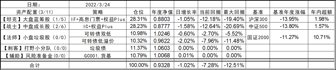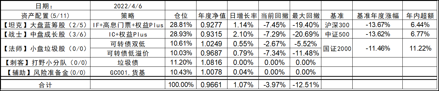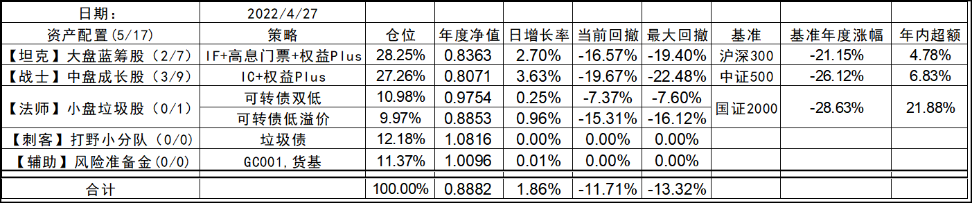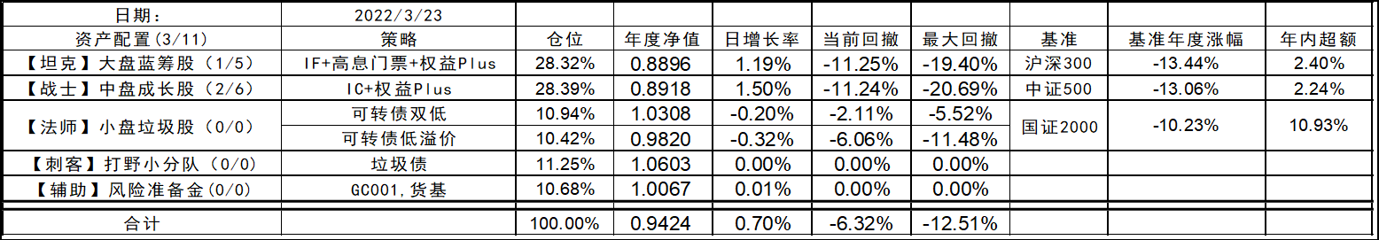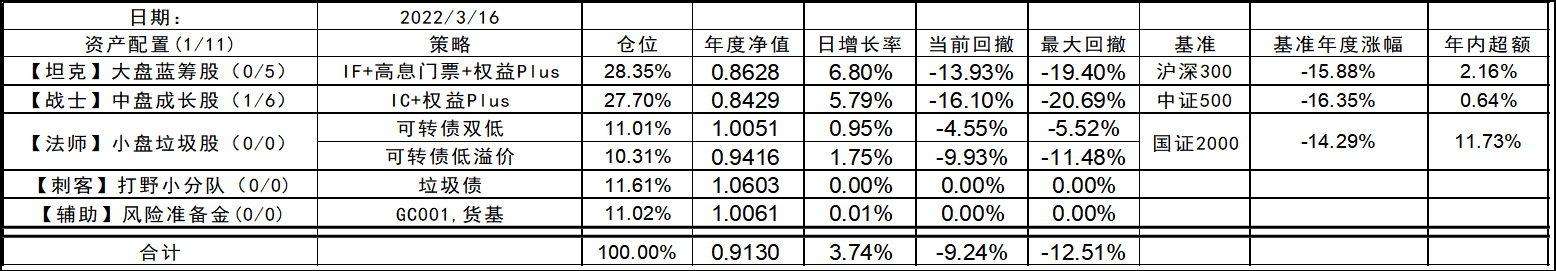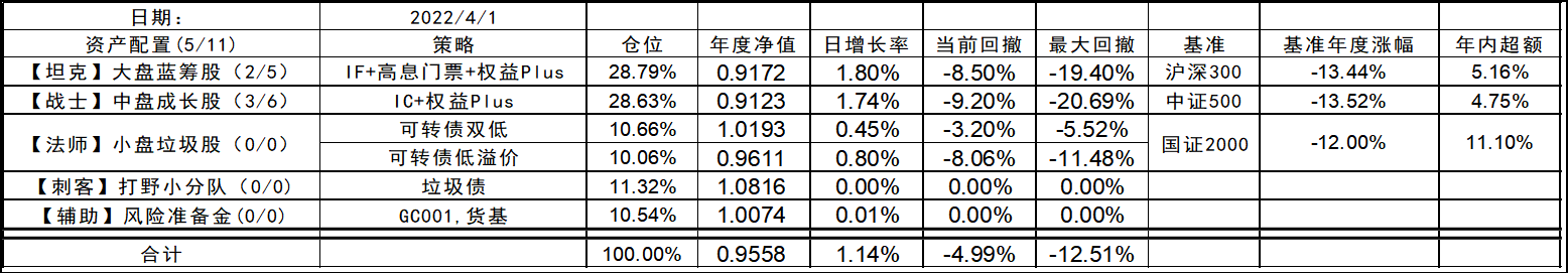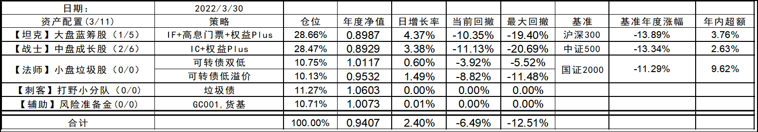 【坦克】,【战士】,【法师】可转债这个月都表现得中规中矩。这里面今年表现最好的仍旧是双低策略具有更好的表现。虽然转债相对国证2000的超额收益有所收敛,大盘和中盘均能有些许超额收益,也是还不错的。另外半伽马薅羊毛策略第一季没有赚到什么钱,希望第二季能早点到来,不可能每次都不赚钱吧。