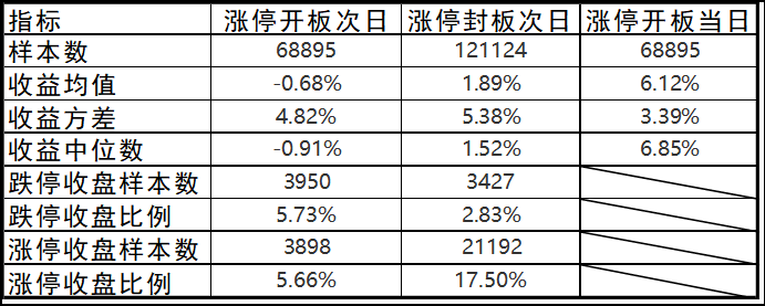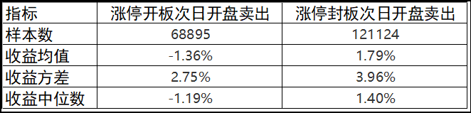 很不幸,无论前一天是开板还是封板,选用第二天开盘就卖出会亏的更多。期望收益率会下降到-0.37%。