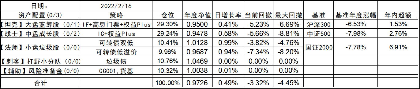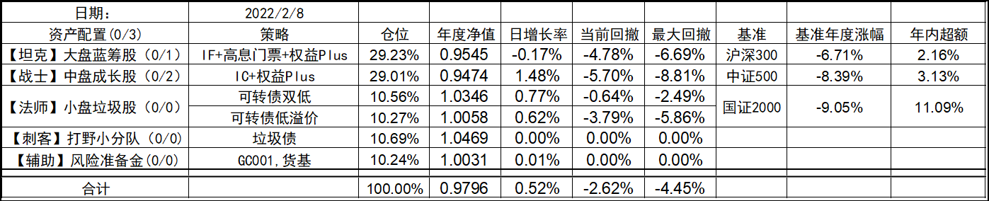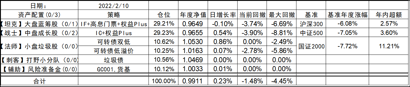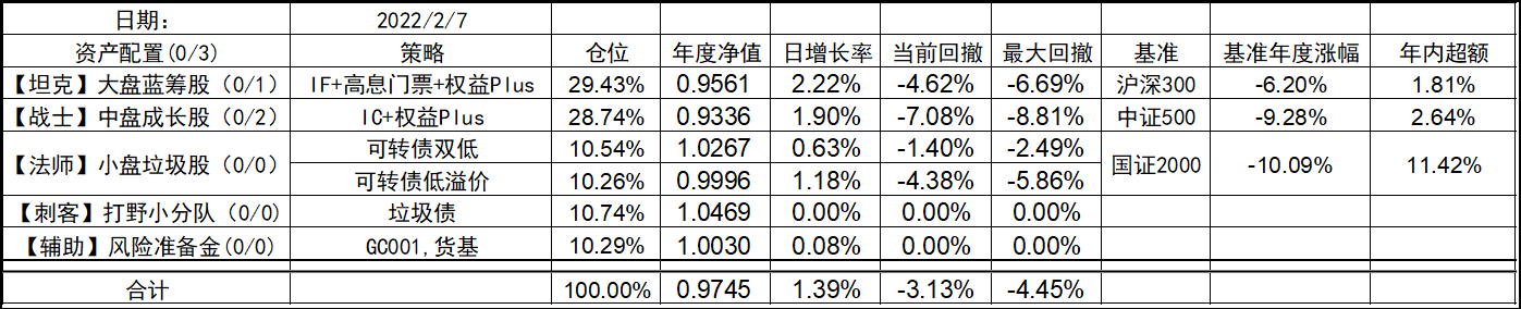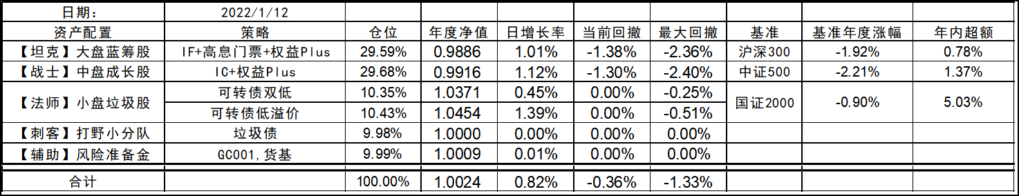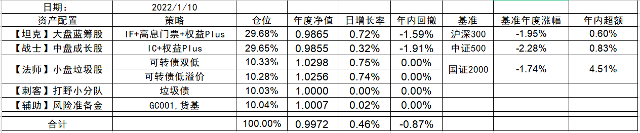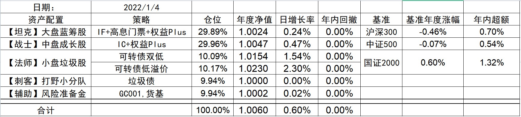 回到今天的市场上,首日取得了开门红。上路的【法师】可转债策略疯狂输出,险些拿下一血。中路的【战士】和【辅助】稳扎稳打,下路的【坦克】抵挡了敌人一波疯狂的攻击。打野的【刺客】默默练级。虽然是好的开局,但今年仍不乐观,希望能够达到0%的收益目标。