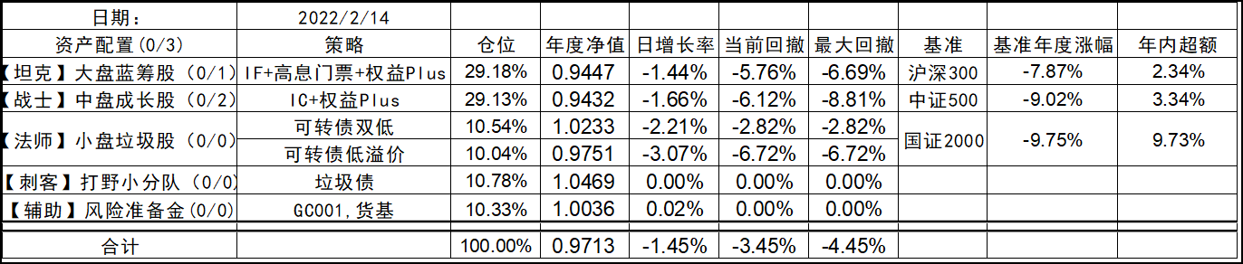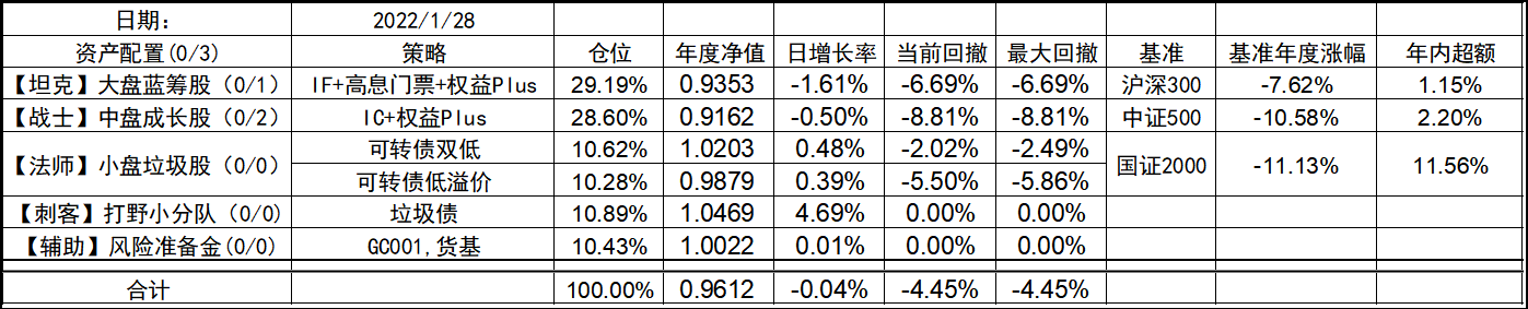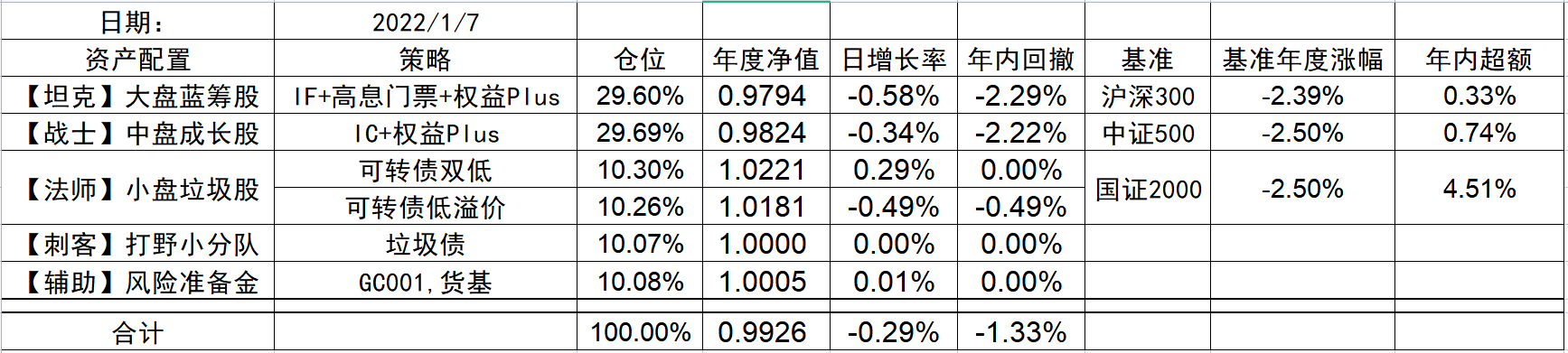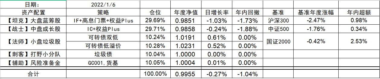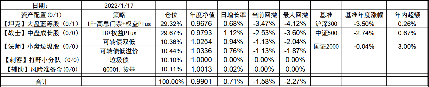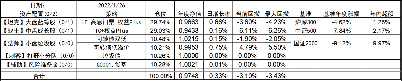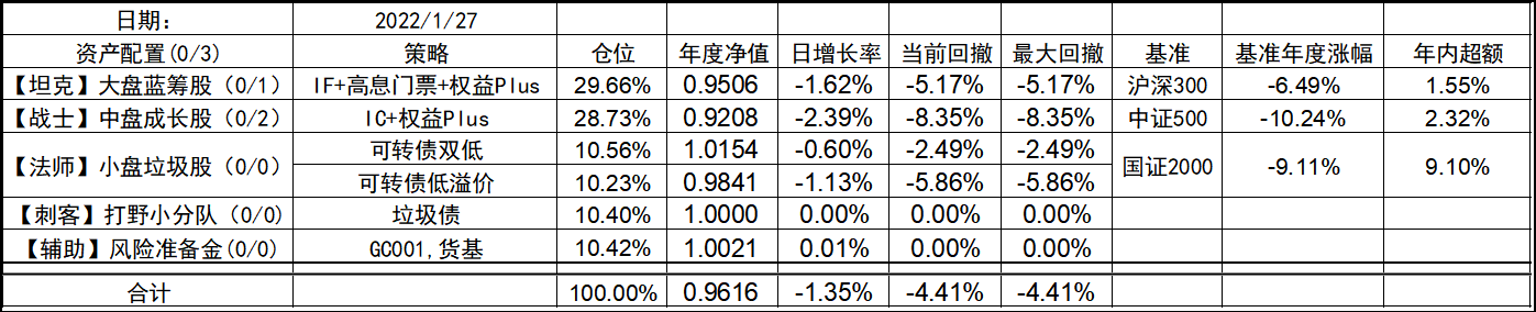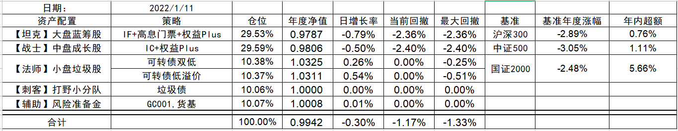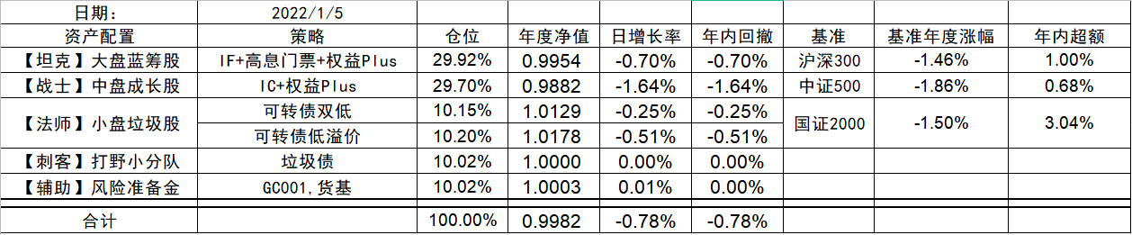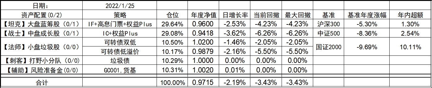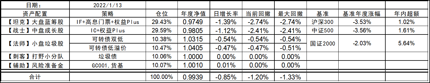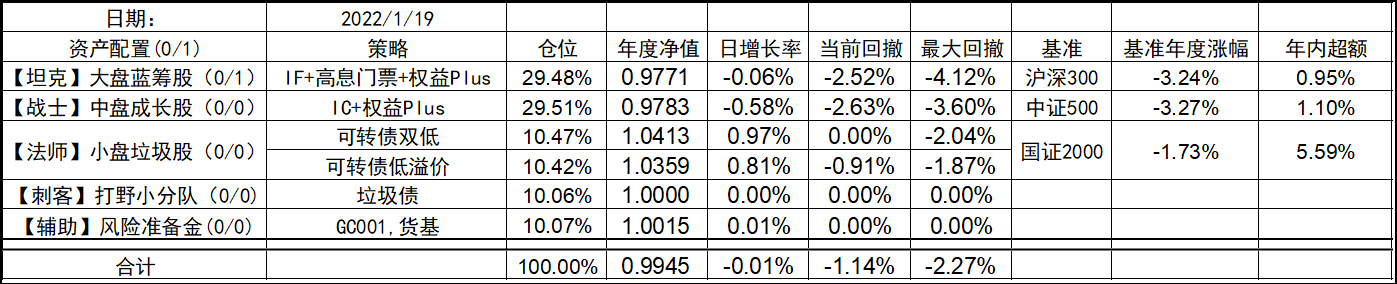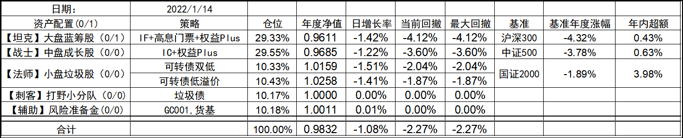 2022-1-14果然昨天预言准确,谜底揭晓,【坦克】蓝筹贡献的今年的第一滴血,前两天苦苦支撑的银行也倒下了。【战士】也战的只剩残血,敌人再放个大招也得回家补血了。【法师】可转债也才真正遭受了今年来的第一波攻击,实际今天国证2000没怎么跌,但溢价率大幅下降。