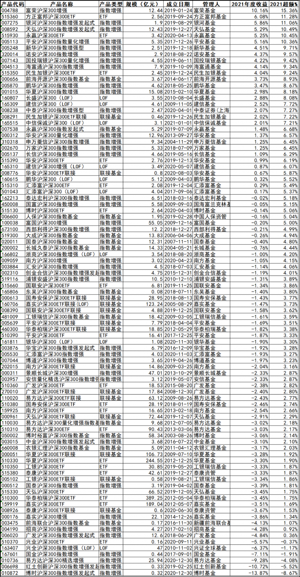 下面以沪深300指数为例,列举市面上可以买到的指数挂钩基金,且成立于2021年之前,他们2021年的表现如下图所示。