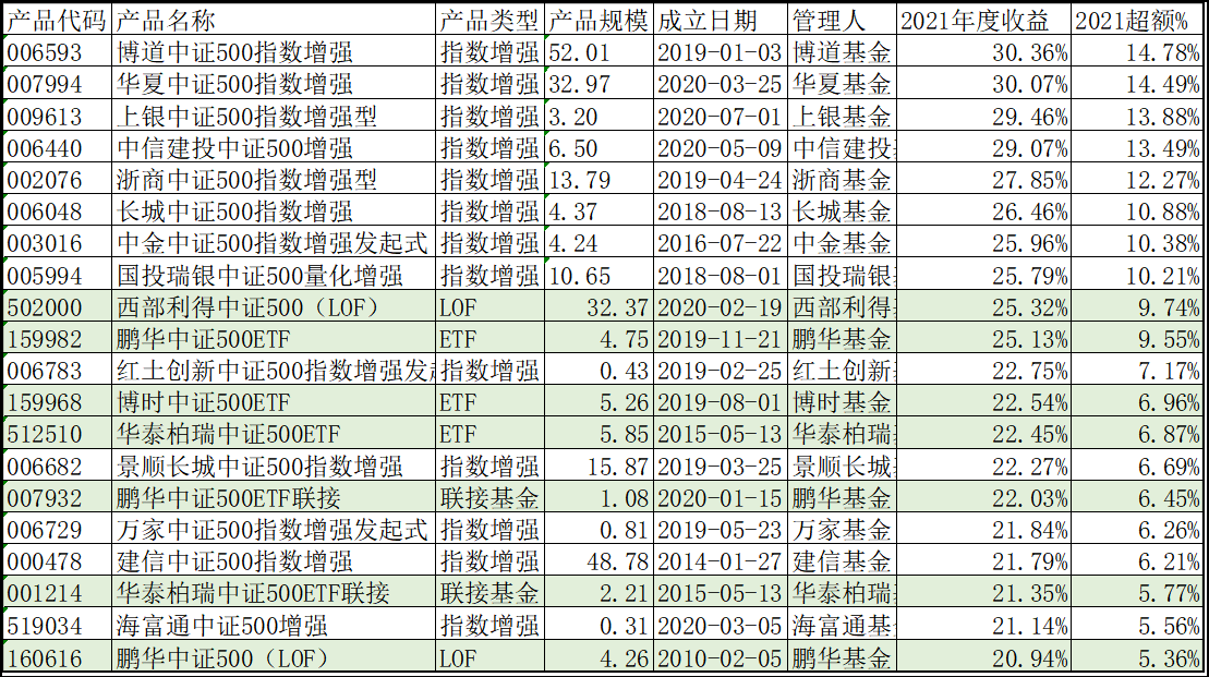 而对于不带杠杆,仅仅将IC作为中证500ETF替代的投资者,只要IC的升水+分红,小于释放现金部分的现金管理收益,就已然可以选择利用继续持有IC。但如果IC升水+分红大于现金管理收益了,则完全可以换成中证500指数基金。如下图整理了去年超额表现不错的挂钩中证500的基金。当然,如果是利用多因子选股产生的增强,可能会不太稳定。下面标绿的均为完全跟踪指数,其增强部分大多来自于网下打新等。这一块收入在新的一年也需要打个大大的问号了。