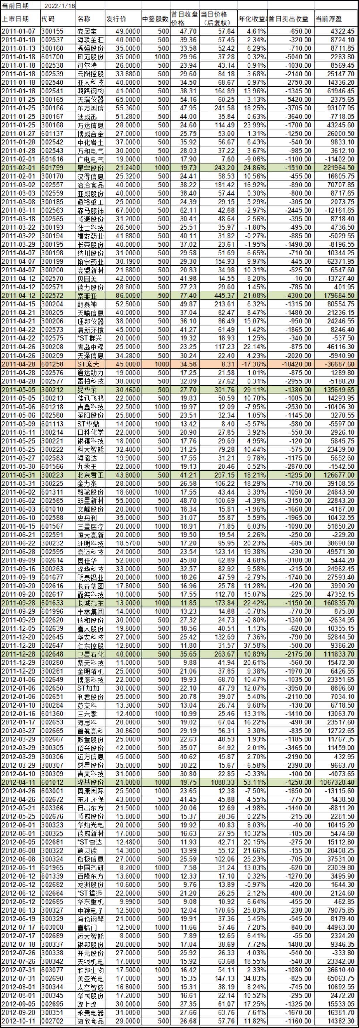 2022-1-18自从去年四季度新股询价机制变化后,目前新股进入了上市即破发的阶段,这对于2014年以后入市的股民来说都是新的经历。而在我的记忆中,大概十年前有那么一段时间,和现在算是比较类似,不少新股以高于100倍的市梦率发行,然后上市即破发。我找了一下数据,大概发生在2011年初到2012年10月,大量的新股破发,让新股发行暂缓,同时也让纯现金打新时代结束。那次暂停的时间长达1年3个月,直到2014年初开重新开启市值+现金的打新模式。也是那时起,才又一次有了门票的概念。之所以是又一次,是因为听更老的股民说,很早之前也有过市值打新,但那个年代对于我过于久远。