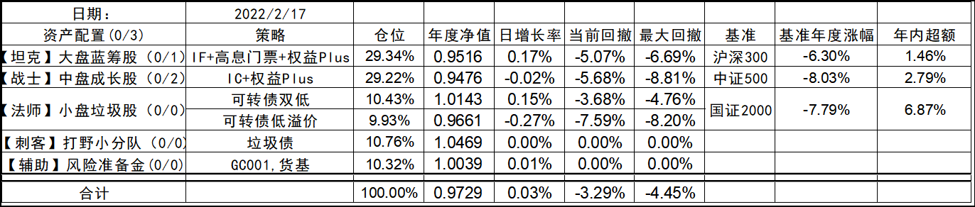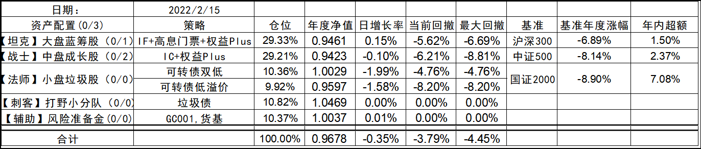 今天的市场依然延续涨一天跌一天的走势,这种走势对于趋势投资者来说是最难受的。可喜的是,【法师】双低可转债策略创了新高,【坦克】蓝筹股因为门票吉视传媒的涨停才没有怎么跌。而总体净值和昨天几乎一样。