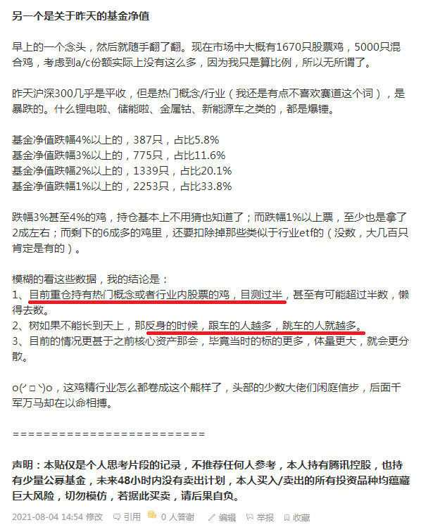 2、市场的系统性风险,似乎是在聚集,虽然自己从不以此作为投资的依据,但是会让自己很不舒服。但凡市场从胡炒A,转向胡炒B,甚至是胡炒C,基本上就离泥沙俱下的崩盘不远了。现在有二期的症状,所以自己会不爽。