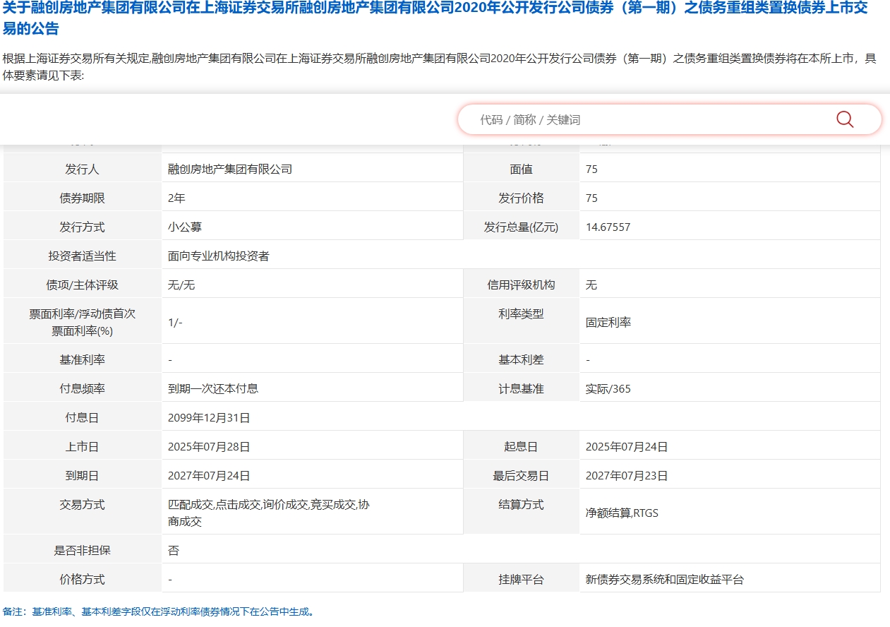 根据上海证券交易所有关规定,融创房地产集团有限公司在上海证券交易所融创房地产集团有限公司2020年公开发行公司债券(第一期)之债务重组类置换债券将在本所上市,具体要素请见下表: