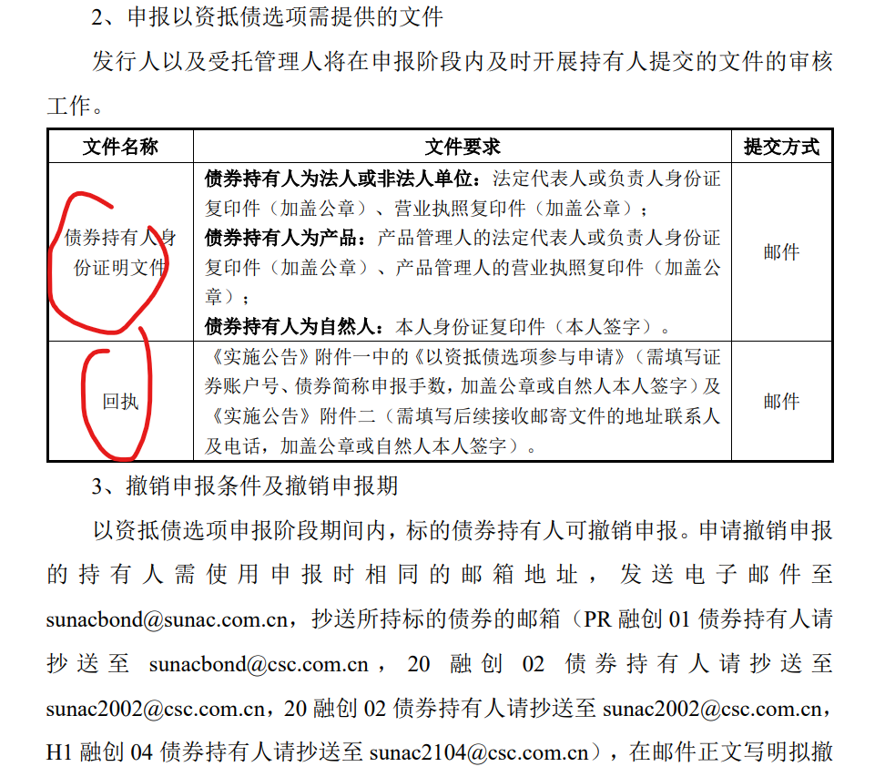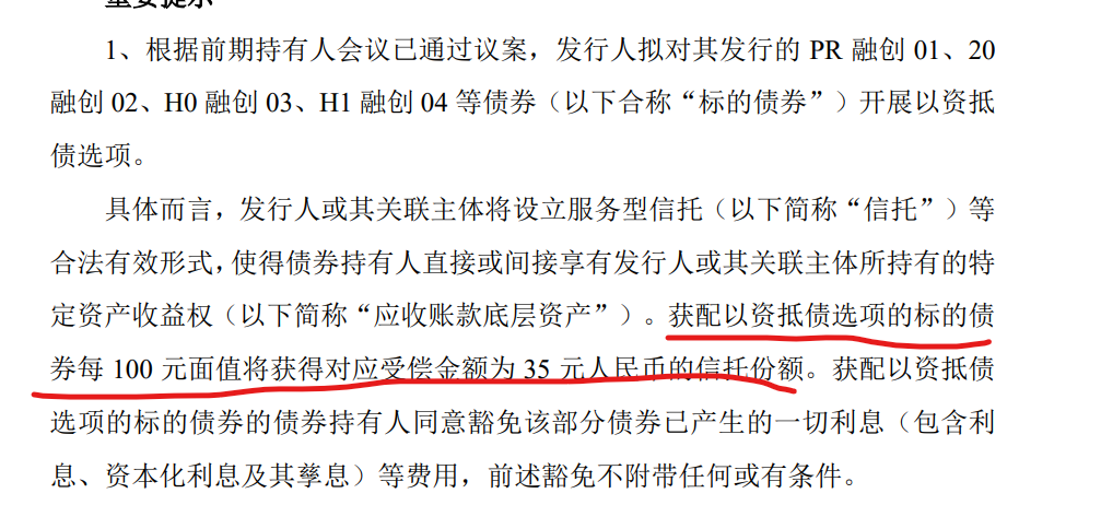 相关方拟採用设立服务型信託或其他合法有效形式,按每人民币100元剩馀面值标的债券受偿人民币100元信託份额的比例,偿付待偿本金金额不超过人民币40亿元的标的债券,使得标的债券持有人直接或间接享有现有增信资产中位于北京的商业项目收益权(股权收益权、合伙企业份额收益权或关联方借款债权)。信託存续期限不超过108个月。