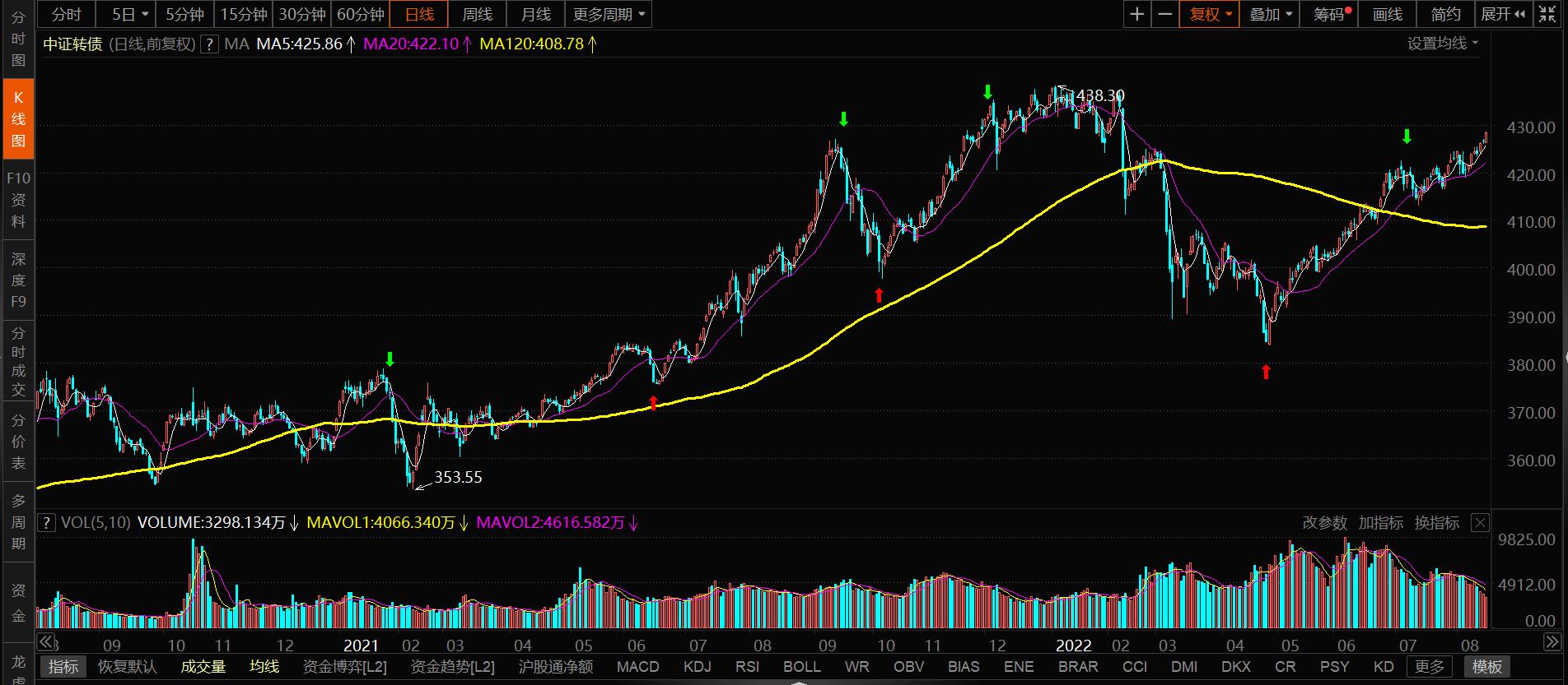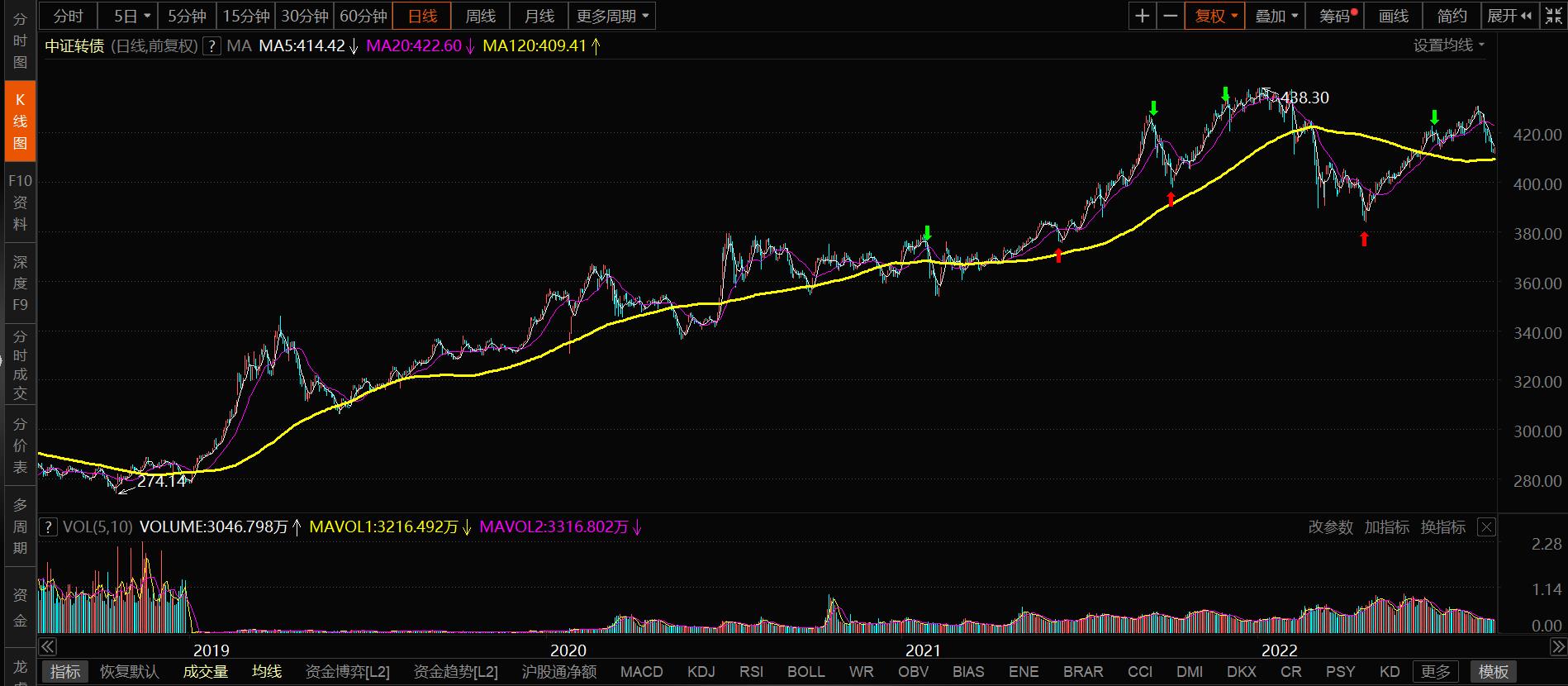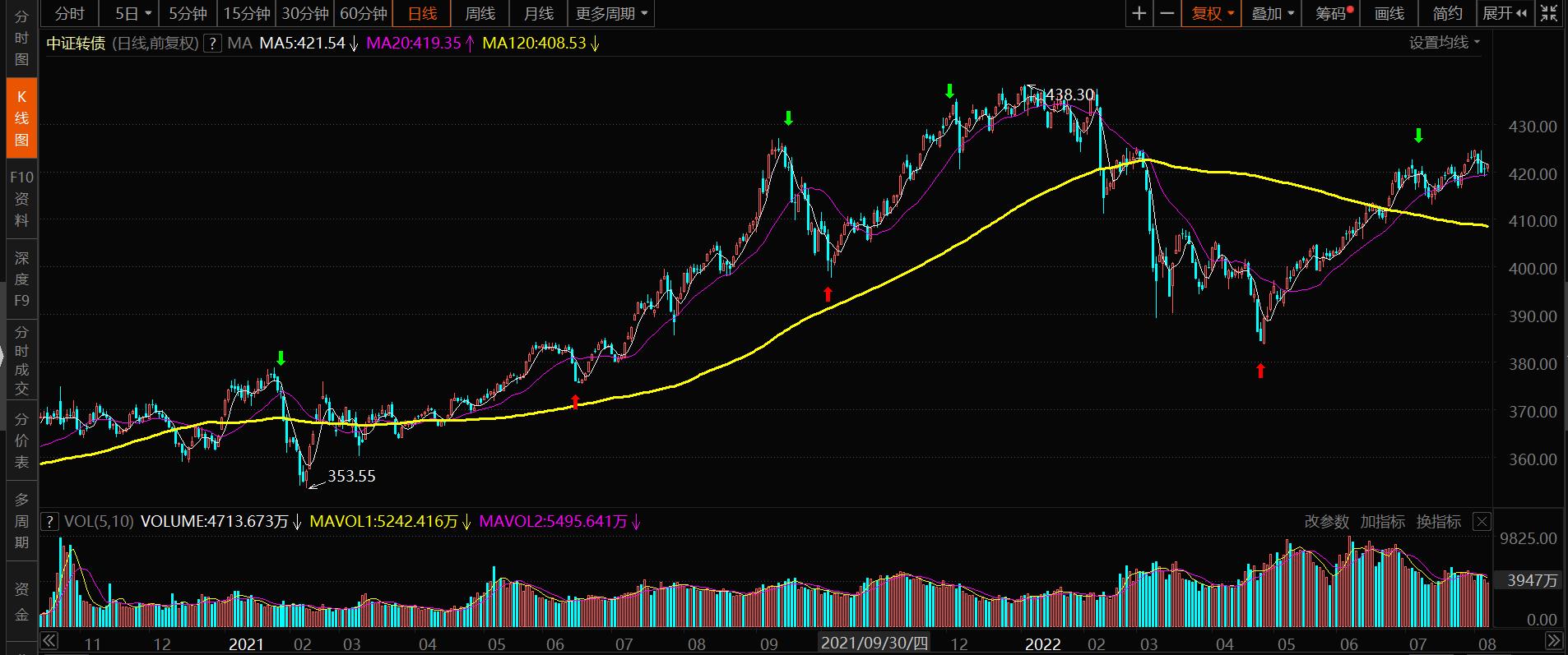 在杀跌一波后的反击上,优先选择还得是热门赛道的热门债,盘子小,永远是优先考虑的因素;其次价格区间的选择,不能只盯着110以内,甚至105以内的债看,很浪费时间,多往上瞅几眼,杀到120日线以内的,就差不多可以捡筹码了;第三是溢价率,市场成交额大的行情时,溢价率可以暂时忽略,但如果像现在这样的低成交额行情,溢价率也得多考虑几脑。