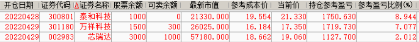 2、其他三支小仓位股票,芯瑞达、万祥科技及泰和科技,开盘在低位都加了一倍的仓位上去做T。万祥科技和泰和科技的做T仓位在回落时出掉了,进一步降低了成本。这里要说一下做T,我这个做T的水平实在太差了,两个T都卖在了回调的最低点,而且是一卖完还没有一分钟就上去了。郁闷半天。芯瑞达的还没有出。